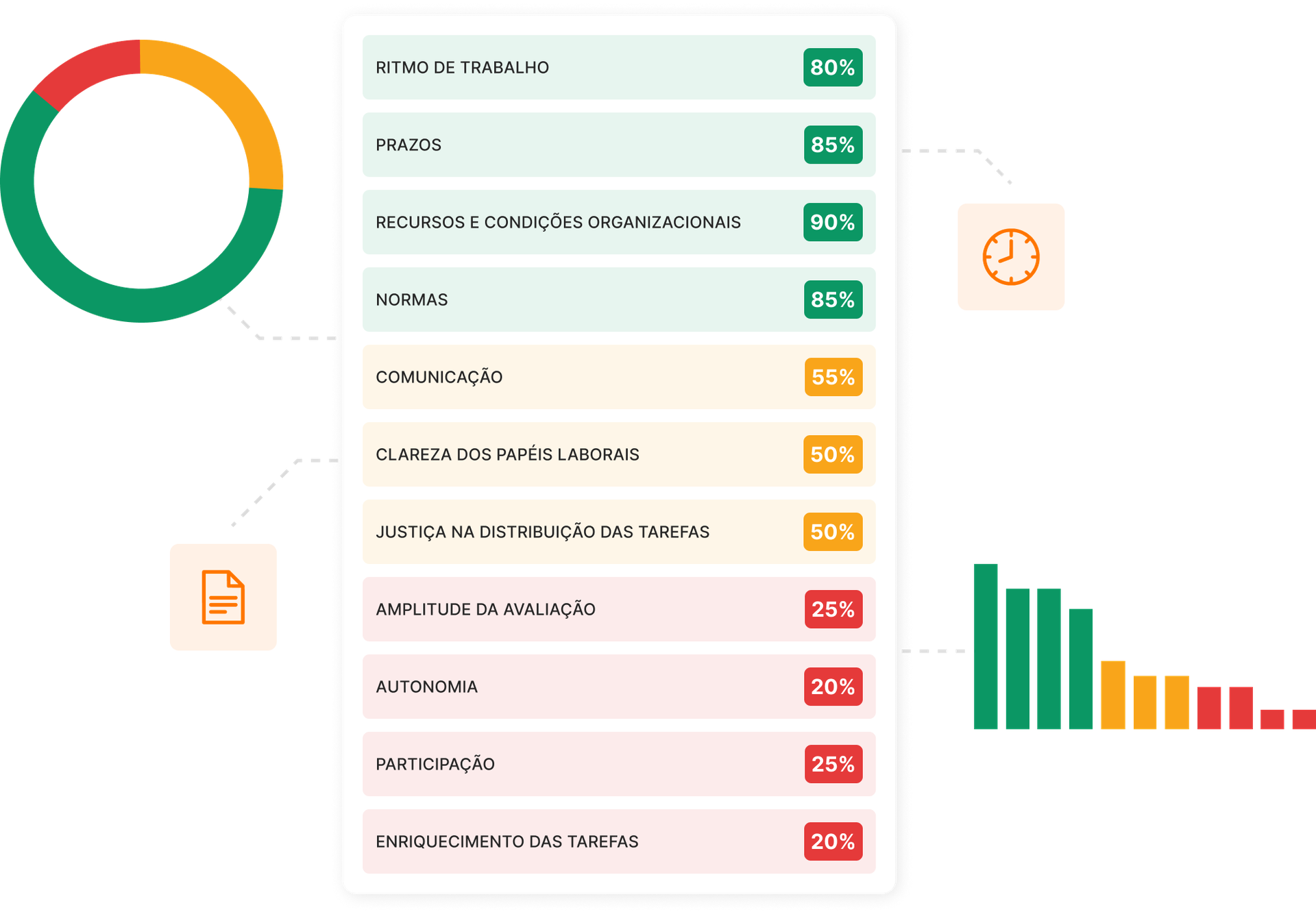A estrutura do trabalho influencia diretamente a satisfação e o desempenho dos colaboradores. Avaliamos aspectos como carga horária, ritmo de trabalho, prazos, normas organizacionais, clareza de funções e comunicação interna, buscando promover um ambiente equilibrado e eficiente.